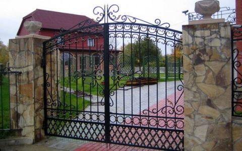 - Ворота решетчатые или из сплошного полотна, украшенного ковкой.